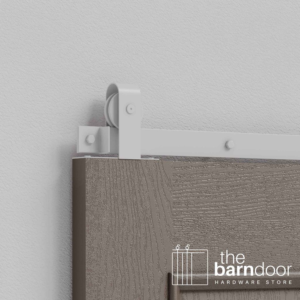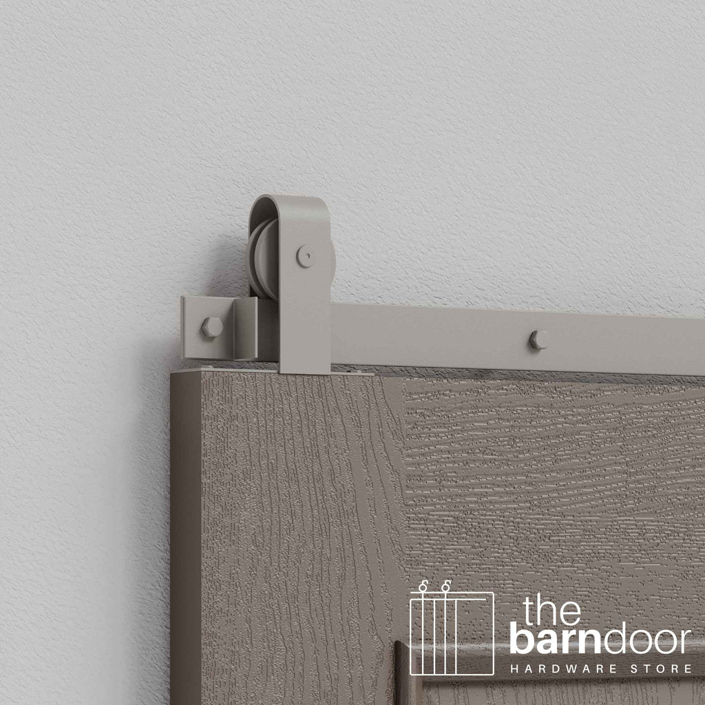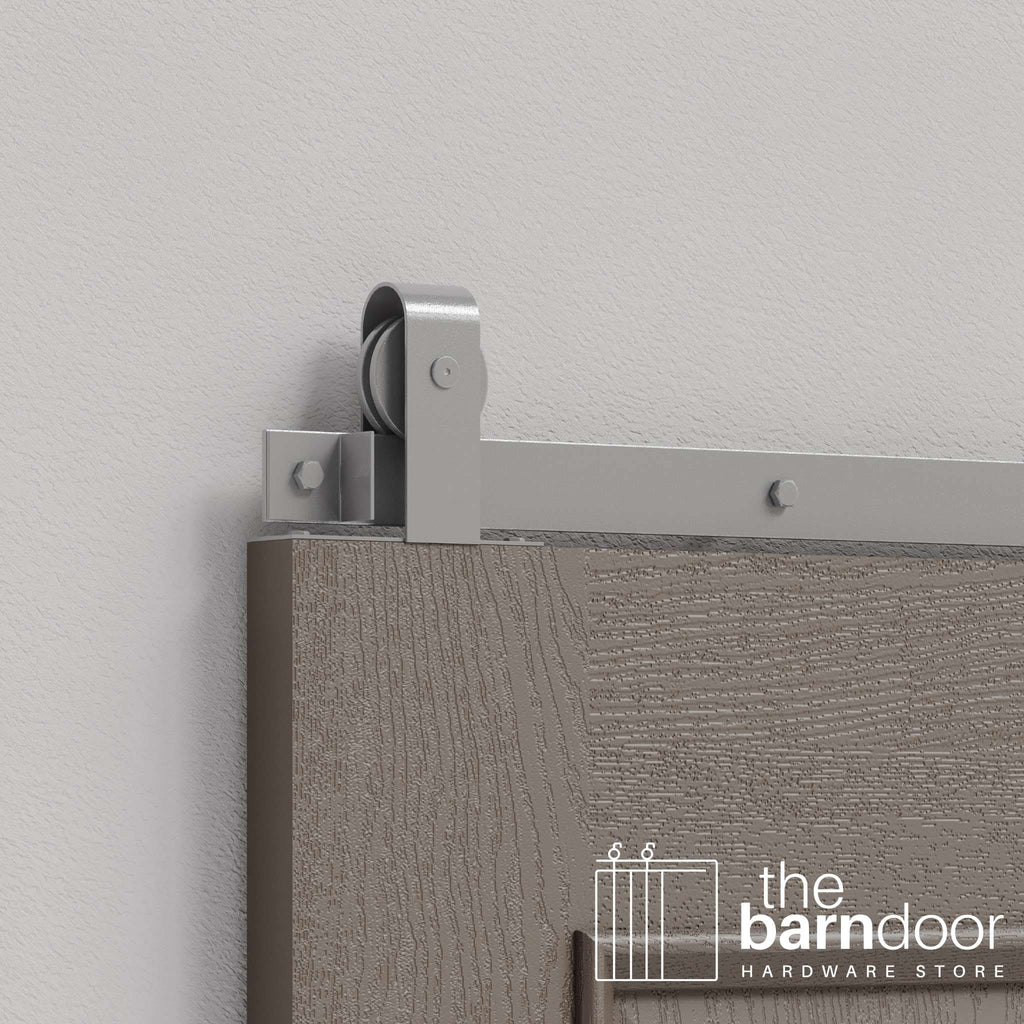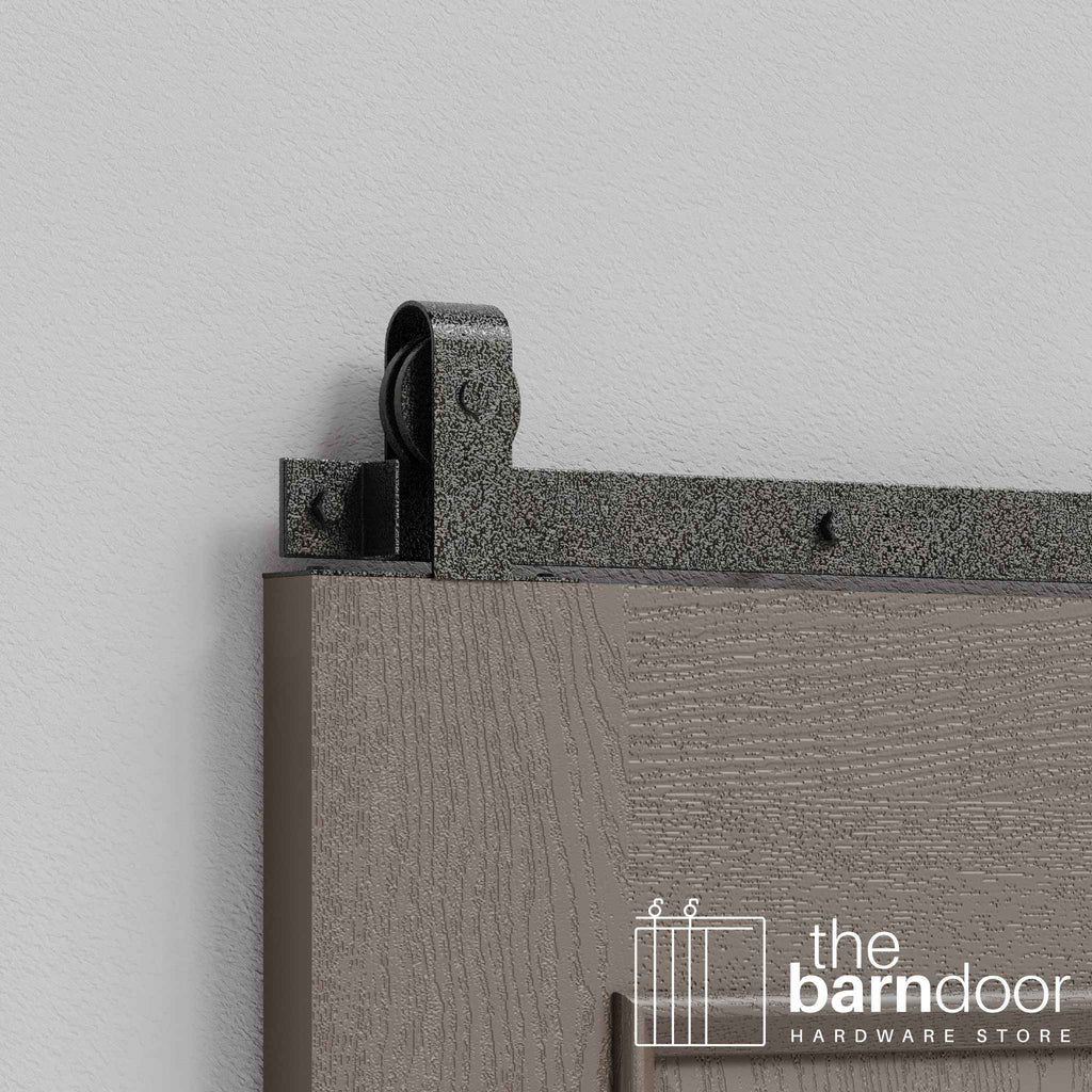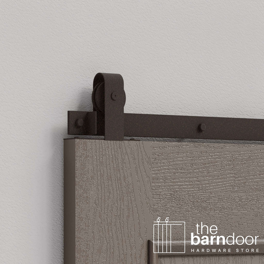 The top-mounted roller configuration positions the hardware above the door for a minimalist appearance while maintaining the familiar curved J-strap aesthetic. Perfect for interior doors, closets, pantries, and spaces where you want traditional barn door character without visible front-mounted rollers.
