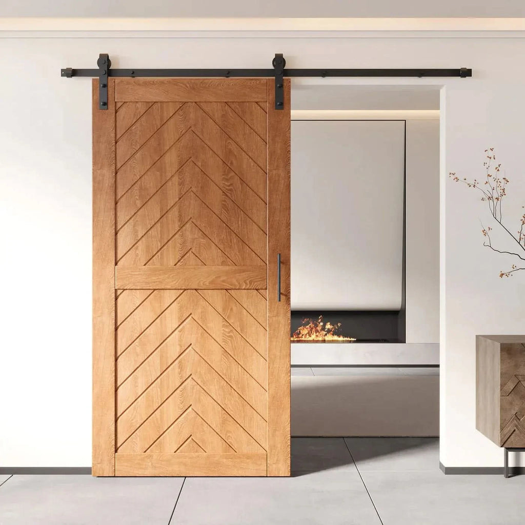 Imagine a striking fishbone pattern in beautiful natural pine wood transforming your entryway. This door is a genuine showstopper, giving your home that custom, high-end look without the fuss. It slides smoothly out of the way, freeing up floor space that swinging doors just hog. Perfect for pantries, home offices, or dividing up an open living area, it's about smart design that looks incredible.